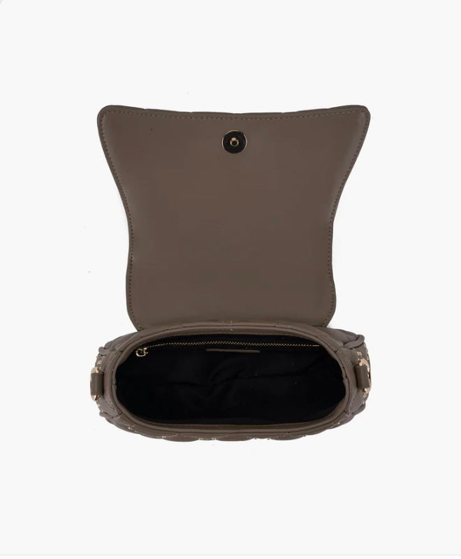 Piccola pochette in ecopelle nappata con lavorazione matellase e microborchie, manico e tracolla rimovibile