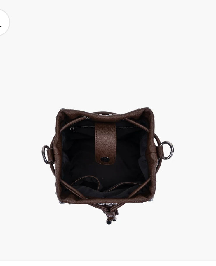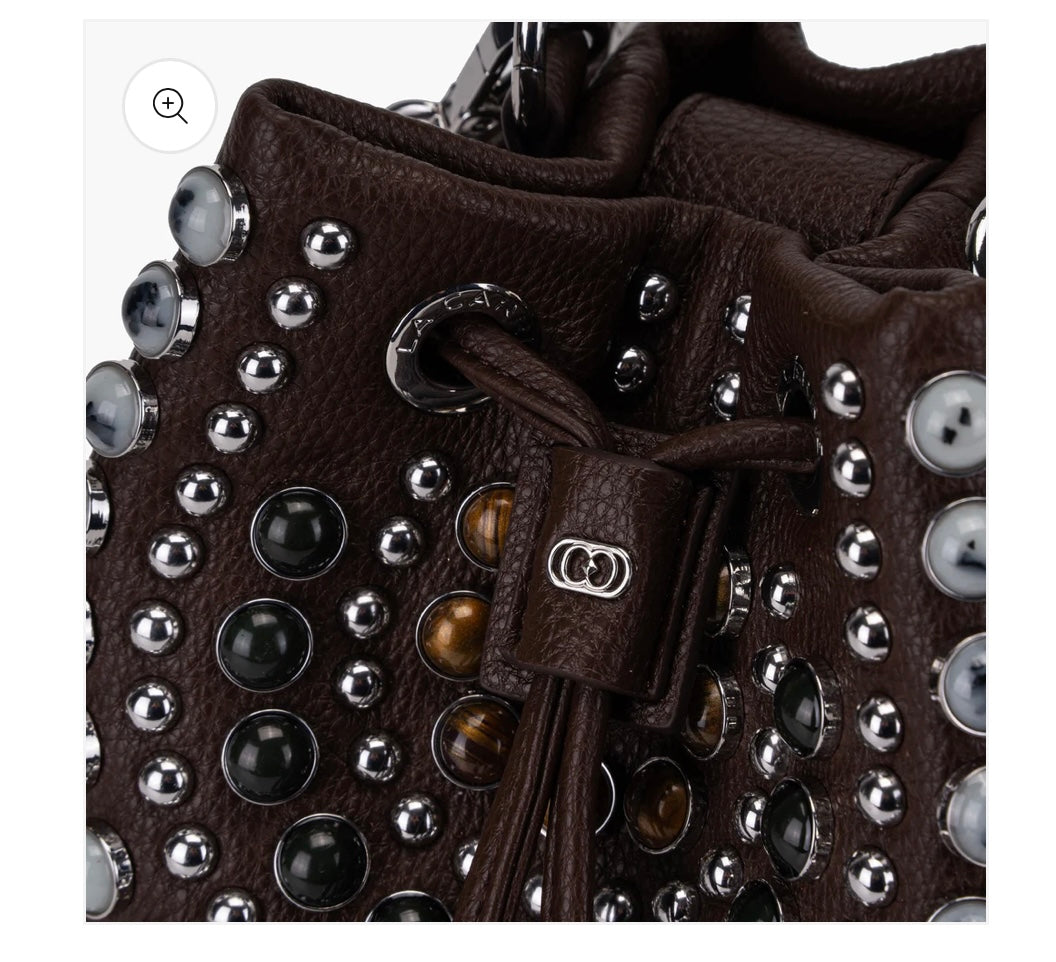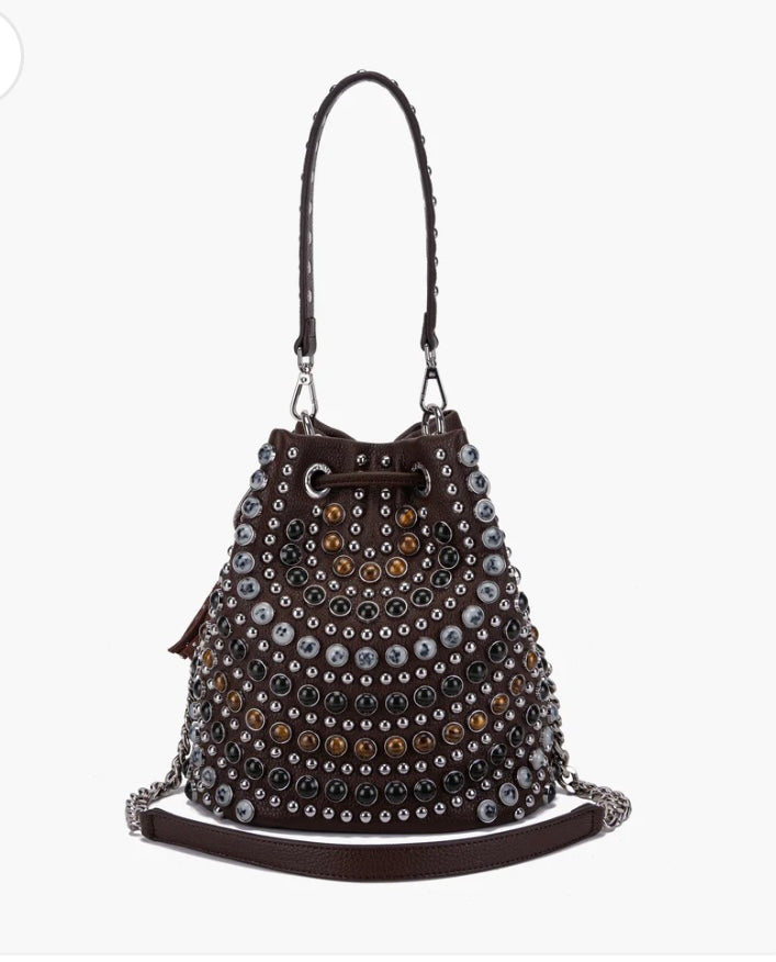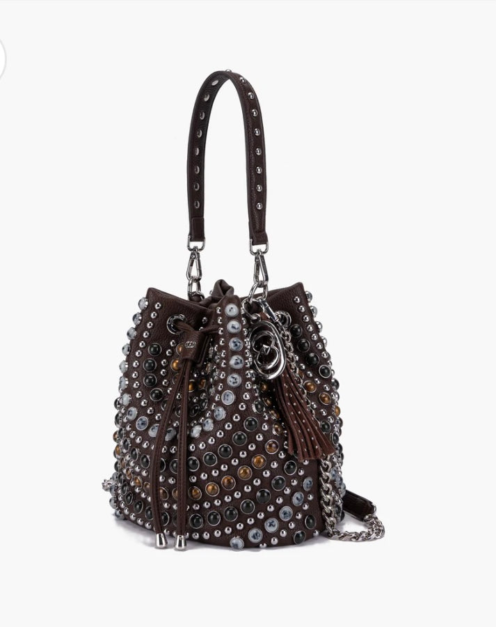 Secchiello in ecopelle martellata con applicazioni di borchie e pietre dure con cabochon; manico e tracolla rimovibili