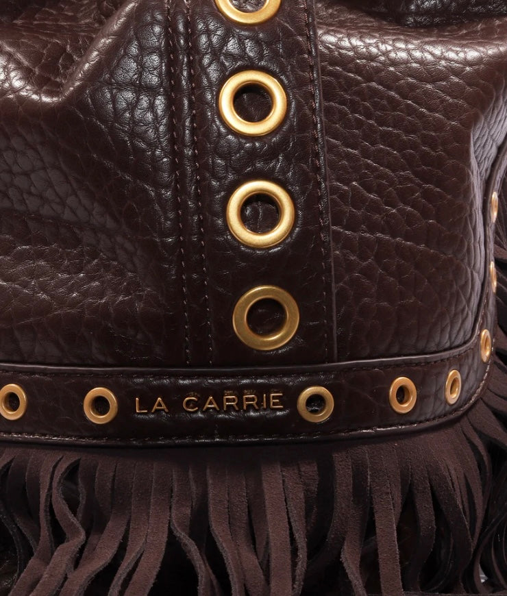 Secchiello in ecopelle effetto martellato con frange ed occhielli in oro , tracolla e manico